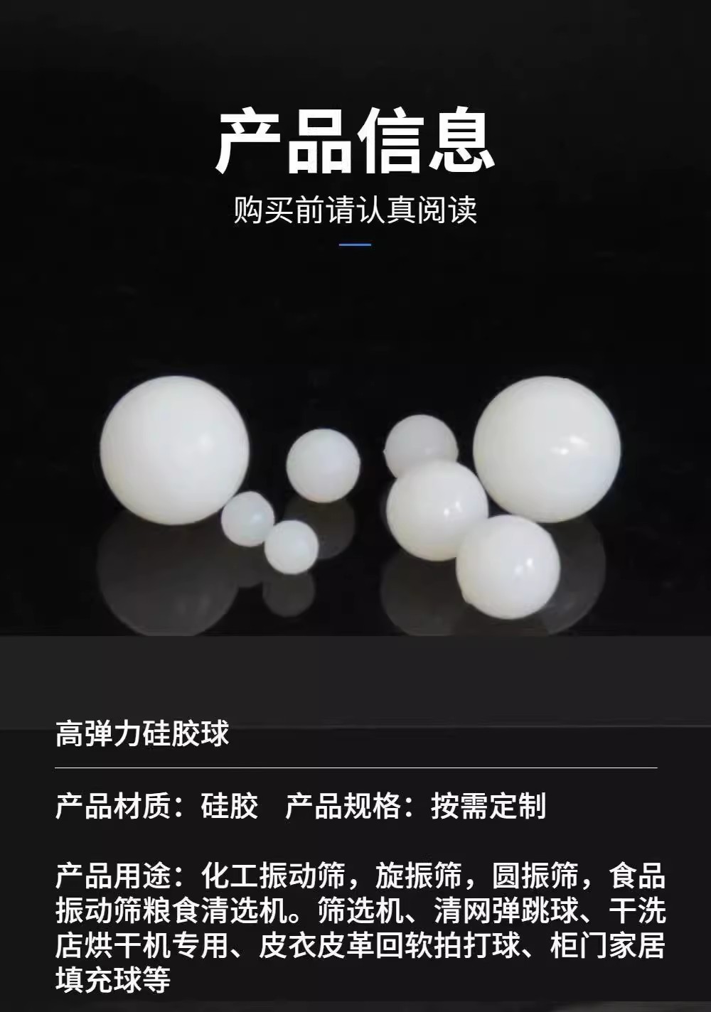 安裝在旋振篩的沖孔板與篩網(wǎng)之間,當(dāng)旋振篩工作時(shí),硅膠球利用自身的彈力和重量,隨著篩體的振動而產(chǎn)生跳動,不斷地撞擊篩網(wǎng),使粘在或卡在篩孔之間的物料被拋起并落下,從而實(shí)現(xiàn)清網(wǎng)功能,提高物料的透網(wǎng)率和篩分效率。 應(yīng)用領(lǐng)域 廣泛應(yīng)用于食品、醫(yī)藥、化工、礦產(chǎn)、機(jī)械、金屬冶金等行業(yè)。例如在食品行業(yè)篩分面粉、糖粉等物料時(shí),硅膠球的環(huán)保特性可確保產(chǎn)品不受污染;在醫(yī)藥行業(yè)篩分藥品顆粒時(shí),能保證藥品質(zhì)量安全。 外觀特點(diǎn) 硅膠球通常為乳白色的透明或半透明球體,外表光滑圓潤,手感適宜,彈性好,韌性足,這種外觀特性有助于其在篩網(wǎng)間順暢跳動,同時(shí)也便于觀察其磨損情況,及時(shí)進(jìn)行更換。