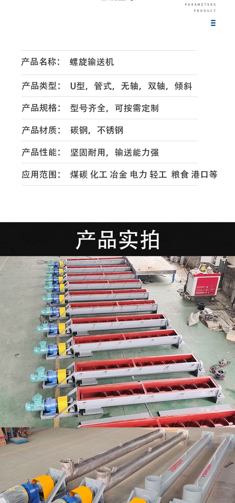 本機結(jié)構(gòu)簡單,橫截面尺寸小,密封好,操作方便,維修容易。根據(jù)用戶要求,電機可安裝于底部,也可安裝于上不,可傾斜輸送,也可水平輸送。